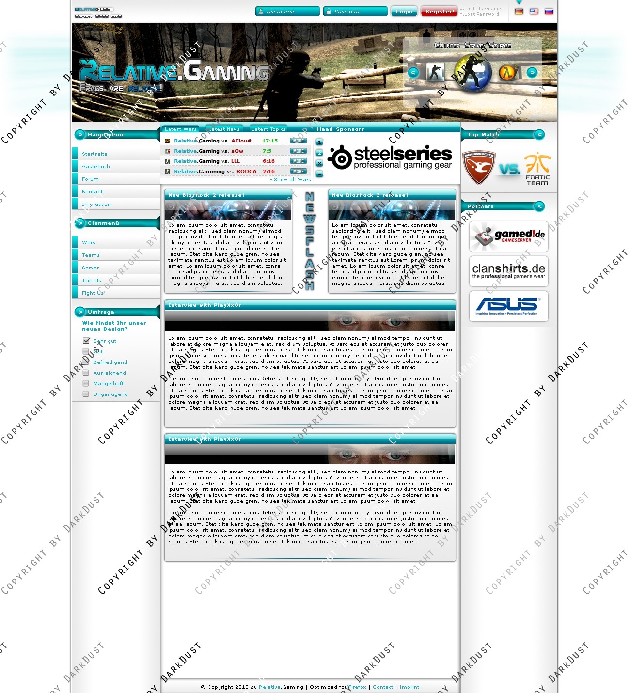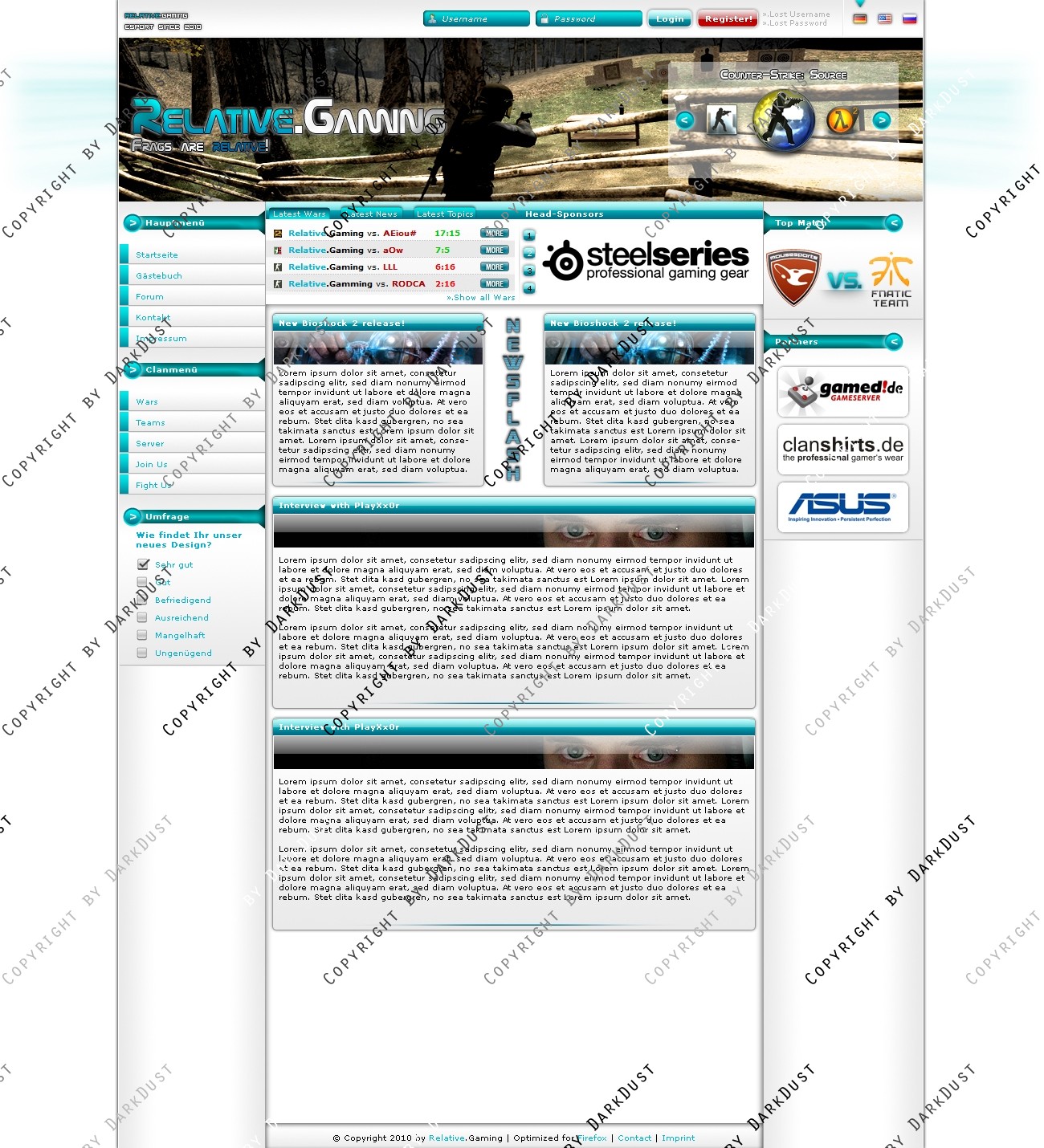 Hier verkaufe ich ein Clan-Design, welches ich in 10,2 Stunden Arbeit erstellt habe. Ich habe ein komplettes Konzept für dieses Design entworfen. Insgesamt soll die Seite sehr schlicht wirken, aber mit dem vielen Blau auch einen Hauch von Frische bekommen. Im Header befindet sich ein Game-Switcher, der auch mit einem Team-, oder Player-Switcher ersetzt werden kann. Alle Boxen im Layout sind natürlich auch in einer anderen Weise einsetzbar, als ich sie dargestellt habe. Insbesondere die Box im oberen Teil des Contents. Ich gebe ausdrücklich jedem Käufer die Möglichkeit, das Design auf eigene Wünsche weiter anzupassen! Für weitere Fragen stehe ich gerne zur Verfügung.