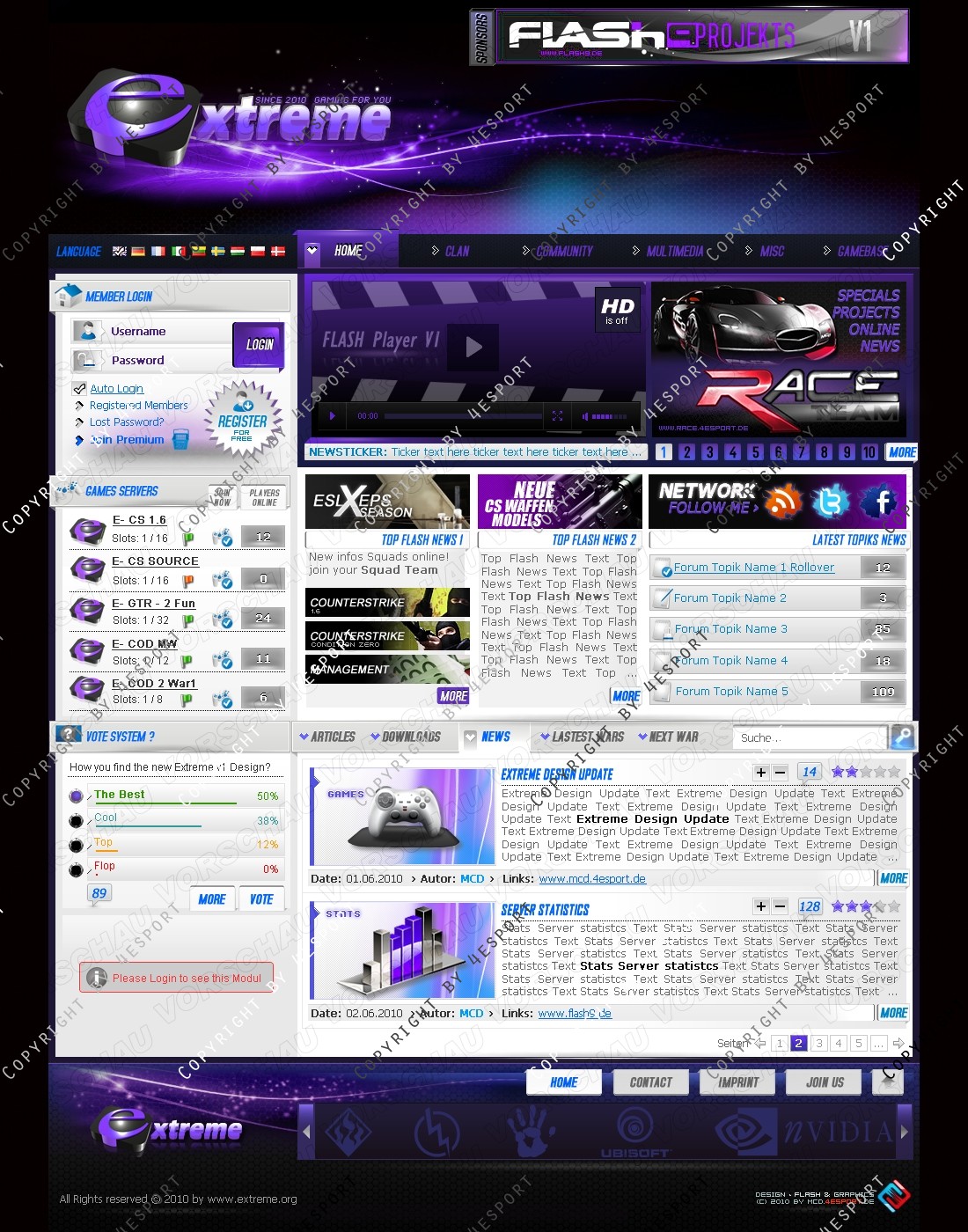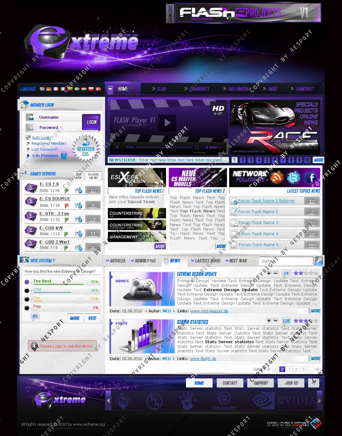 b) Rechte Seite: Top Flash News 1, Top Flash news 2, Network, Forum Topics, Tabs System: Artikels, News, Downloads, Latest Wars, Next War.