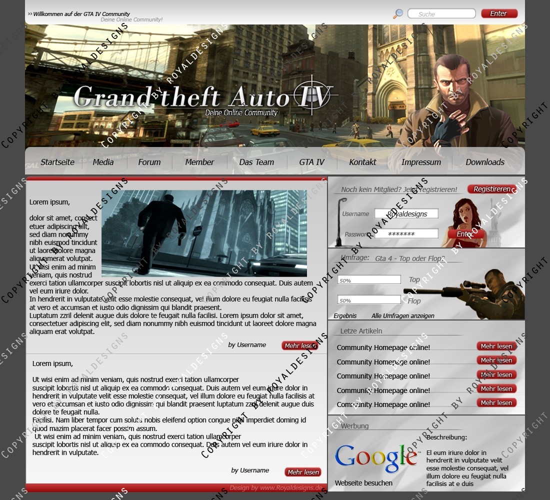 Das Design ist an eine Community angelehnt. Speziell auf eins für das berühmte Spiel des Jahres "Gta IV". Es sind einige elemente eingearbeitet worden, z.b. in dem Loginbereich und weiter runter. Die Gestaltung nimmt die Farben Rot / Weiß an und so ist es geblieben, schlicht und einfach gehalten.Im Packet wären folgende Sachen enthalten: - .psd Datei des Designs - WerbebannerHeader und weitere kleinigkeiten können kostenFREI geändert werden.