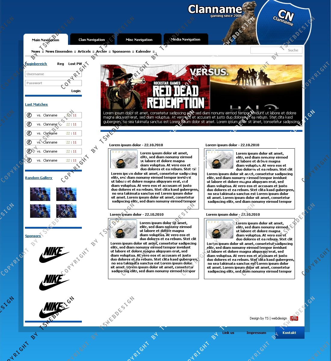Ein super Design für ein Clan. Die Farben sind  Blau-Weiß , auch änderbar als Zusatzmodul. Oben eine Figur von Mordern Warfare 2, dort können natürlich auch andere Darsteller hin designed werden, dass ist Ihnen überlassen. Das Logo habe ich passend zur page gemacht wo man nur noch den Clanname etc. richtig umbennen muss.