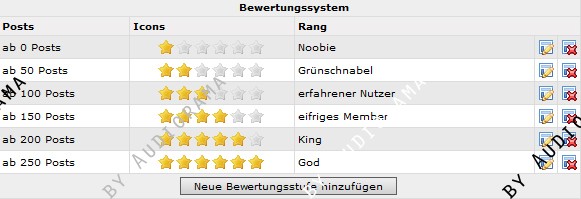 Mit diesem Mod lassen sich Ränge definieren, die ab einer bestimmten Anzahl von Forenposts erreicht werden können. Zu dem Rang selber werden eine für den Rang definierte Anzahl an Icons (hier Sterne) angezeigt, welche für einen Admin bzw. Forenmoderator auch in einer anderen Farbe dargestellt werden kann. Einstellbar ist das ganze bequem über einen neuen Eintrag im Adminmenu.