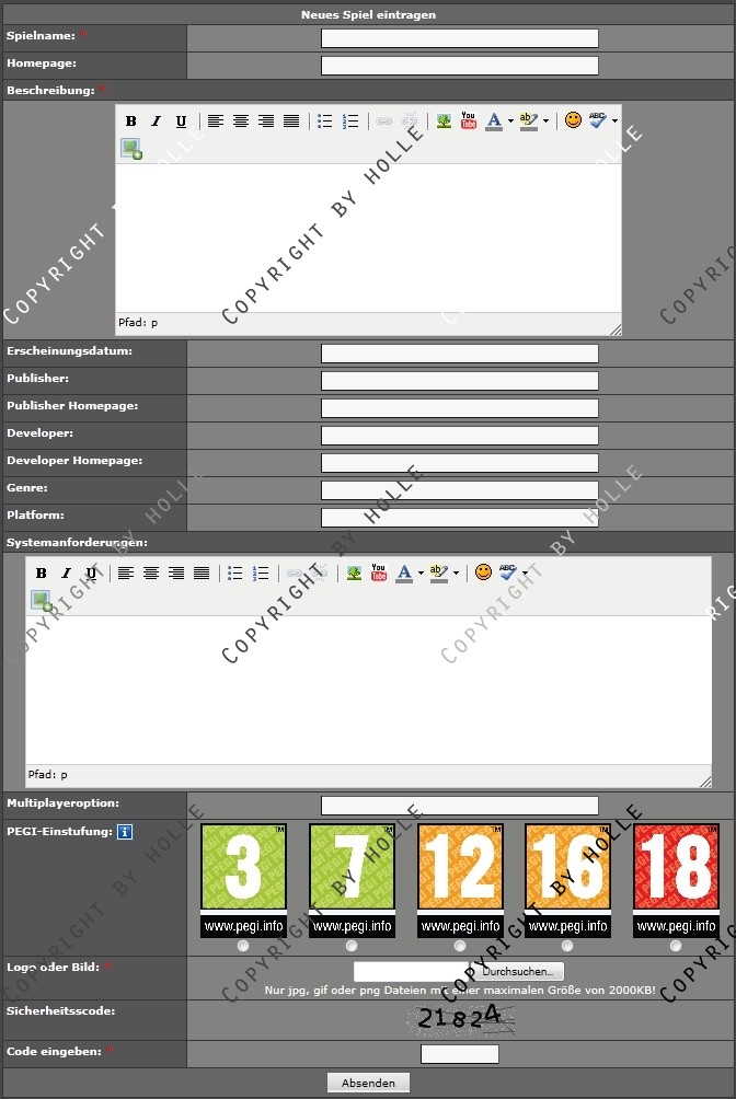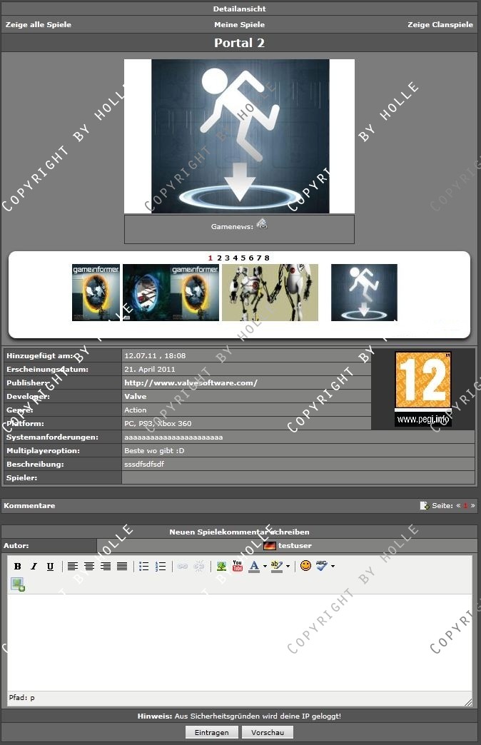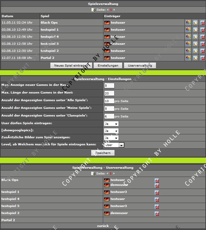 Angelehnt an das System der ESL habe ich hier eine Verwaltung für Spiele im Clan oder in der Community gecode, für die sich Member eintragen können. Zusätzlich können die Member im Clan eigene Spiele einreichen, indem sie ein Formular ausfüllen. (Dieses Feature kann aber vom Admin abgeschaltet werden)