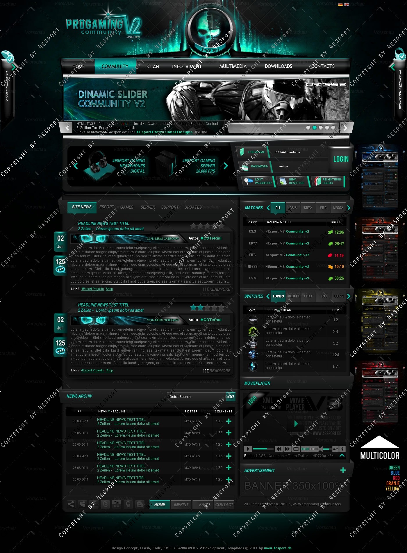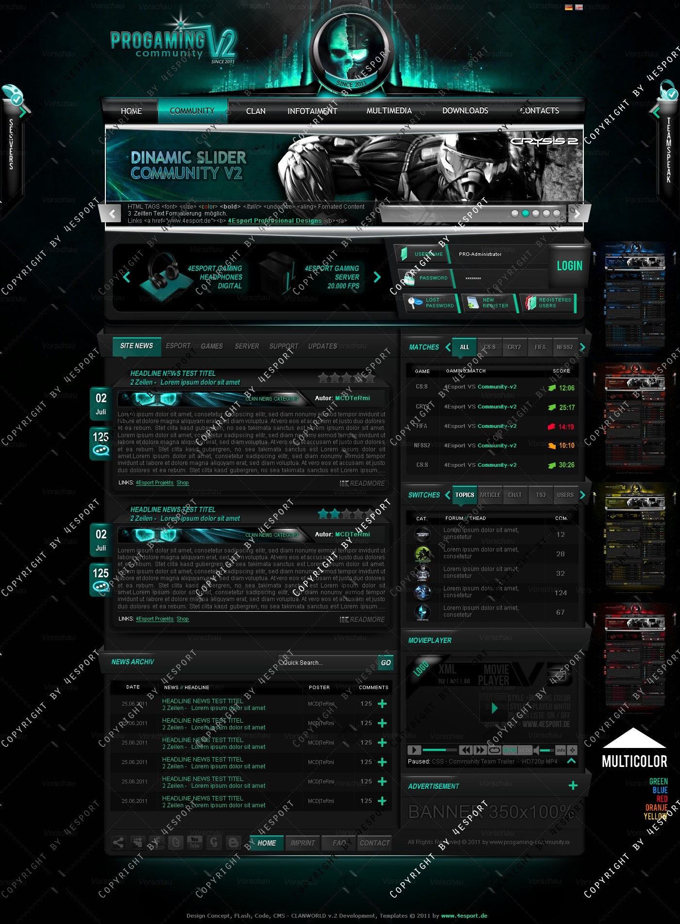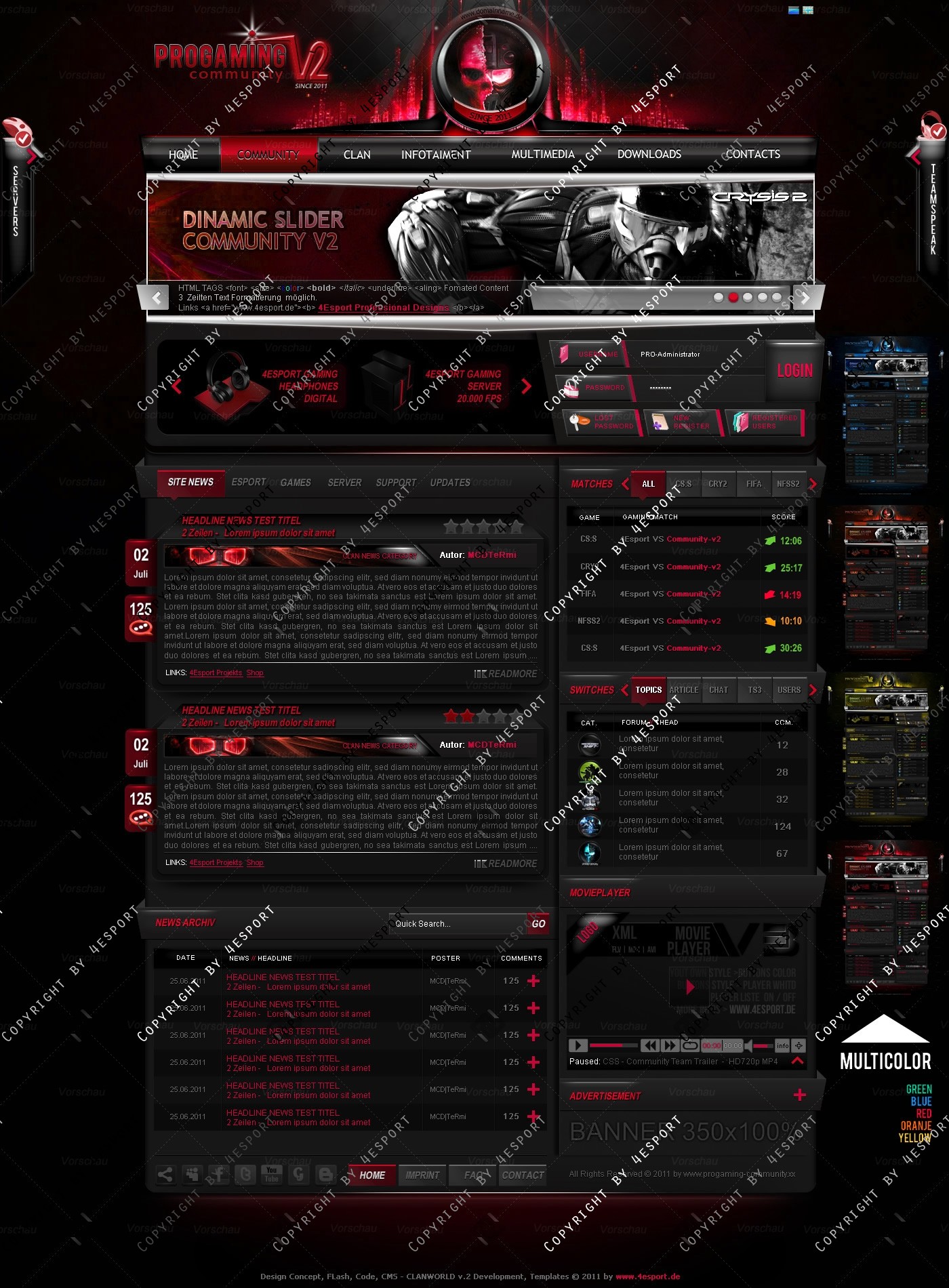 PROGaming Community V2 - Templates Premium Edition mit Flash Player 1 V3 Custom Edition und Featured System, CMS Erweiterung Webspell 4.2.2a, wird auf wünsch auf ClanWORLD v1.1 auch gecodet.