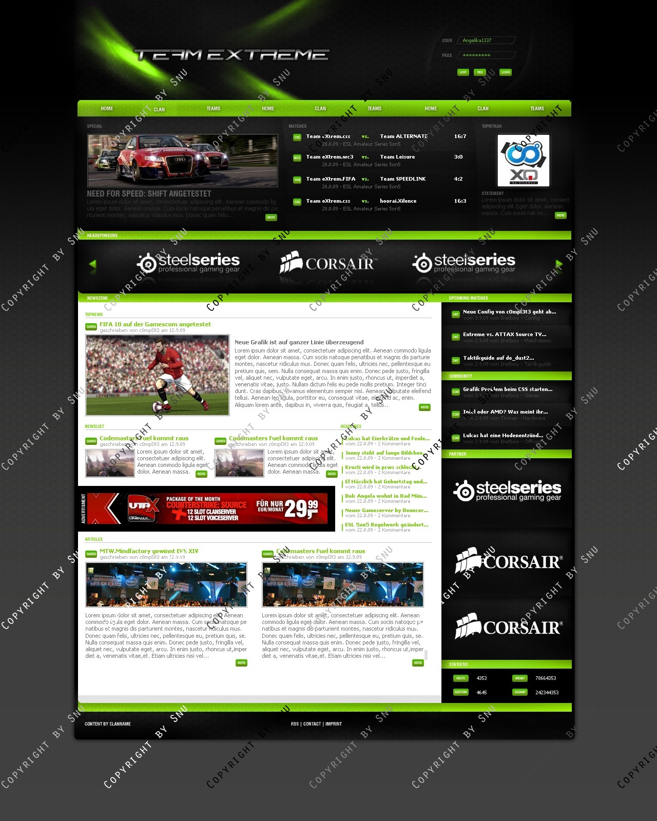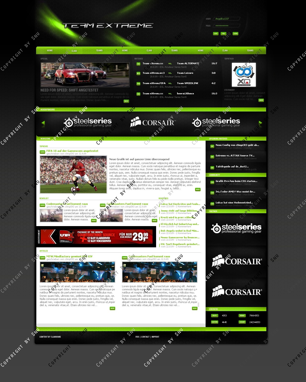 Verkauft wird ein erstklassiges Clandesign, das sich besonders durch seinen cleanen, profesionellen Look eindeutig von der Masse der Designs abhebt. Der durchdachte Aufbau ermöglicht es jedem Benutzer sich in kurzer Zeit einen Überlick über wichtige Informationen zu verschaffen. Eine professionelle Verarbeitung rundet die Erscheinung einer gelungen Internetpräsenz ab.